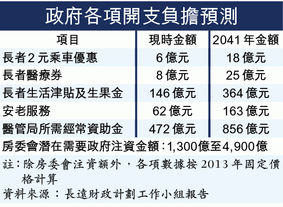目前香港老年人口約有110萬,至2041更高達260萬人,報告指人口老化令社福、醫療開支將大增,當中長者生活津貼開支由現時146億元,大增至364億元;安老服務開支也將由62億元,急增至163億元。