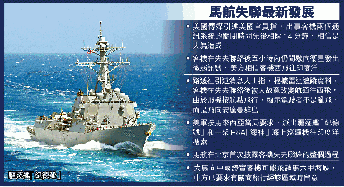 美國海軍應大馬政府要求,調派驅逐艦「紀德號」(USS Kidd)和一架P8A「海神」海上巡邏機前赴印度洋搜索,印度軍隊共派出六艘艦艇、五架飛機搜索安達曼海及區內島嶼。大馬昨天雖再次否認客機引擎有在失聯後數小時內發過訊息,但沒否認美官最新說法,並確認搜索範圍擴大至印度洋。