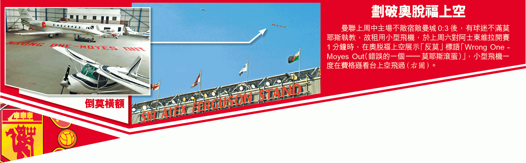 開波前,有記者問莫耶斯,對於有球迷租飛機展示「反莫」橫額的回應;莫帥淡然說:「與其花錢租飛機,他們不如捐錢去費查的結腸炎慈善基金。」開賽1分鐘,鏡頭已影到小型飛機拖住「反莫」橫額在奧脫福上空出現。