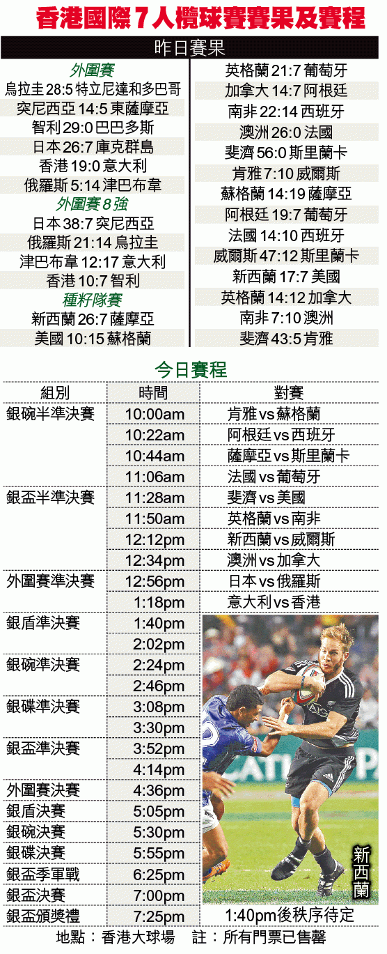 傳統勁旅方面,現於世界系列賽暫列榜首的南非,昨日以7:10爆冷不敵澳洲,僅以B組次名晉級,將與英格蘭會師銀盃8強。至於去屆銀盃決賽隊伍斐濟及威爾斯,順利獲A組首名及次名,亦打入銀盃8強,前者在分組賽以56:0大勝斯里蘭卡,屬首兩日最大比數差距的賽事。