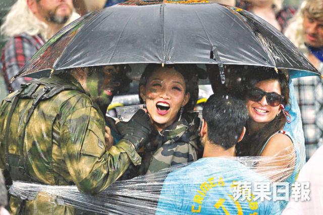 化身貓女郎的Kitty第4度入場,笑言已做足準備帶了雨衣進場,更大讚氣氛一年比一年好。在公關公司工作的Julie進場後遇上傾盆大雨,馬上走到面繪攤位一邊避雨、一邊「扮靚」:「大雨不會掃興,氣氛如此高漲,再下雨也不捨得離開呢!」