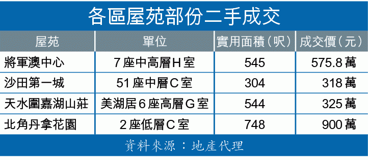 美聯馬立成稱,將軍澳中心7座中高層H室,建築面積726方呎,實用545方呎,昨天傍晚6時才放盤,開價620萬元,放盤不足兩小時閃電售出,成交價575.8萬元,減幅逾7%,較部份銀行估值平11萬元,賣家走貨意欲甚高。原業主2001年11月以217萬元購入,仍大賺近359萬元。