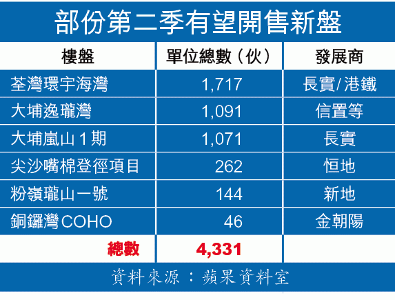 另外,本報統計,第二季可推出的新盤估計可能至少6個,共涉逾4,300伙。