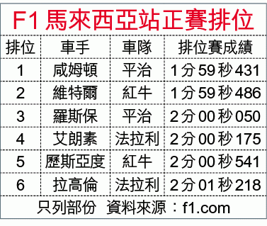 F1馬來西亞站上周六進行排位賽,儘管天雨下意外頻生,熱門車手均順利取得前列位置。其中,紅牛車隊及時為戰車作出改良,令衞冕的維特爾得以造出好成績,只是最終仍被平治的咸姆頓以不足0.1秒之差壓過,周日的比賽只能以第2位出戰。(now671台今日3:45pm直播正賽)
