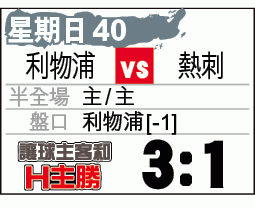 今屆演出重拾勁旅本色的利物浦,為了保持爭標希望,在周日的英超聯迎戰熱刺時,定必全力爭勝;適逢利物浦一對前鋒蘇亞雷斯與史杜列治又入球停不了,攻力不成問題,有力贏多過1球,不妨直取紅軍[-1]的2倍「主勝」,分頭不俗。(球賽編號:星期日40;now621台今日11:00pm直播)