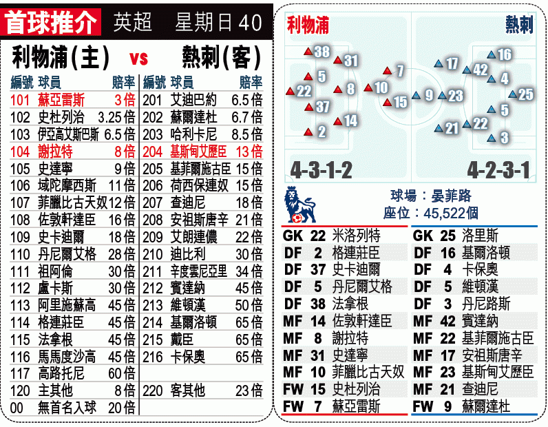 在周日迎熱刺時,利物浦除了後衞荷西安歷基外,其餘主力全部可以候命,相信不難再順利勝一仗。畢竟,紅軍今屆在主場晏菲路球場表現有保證,今季主場聯賽共獲13勝1和1負。熱刺於季中由波亞斯換上舒活掌帥後,表現有所提升,更有機會爭前列踢下季的歐洲賽。不過,熱刺的人腳與實力跟利物浦有距離,而球隊的首席前鋒艾迪巴約又續因傷上陣成疑。可別忘記,熱刺在首循環就試過於主場被紅軍炒5蛋,並令波亞斯掛冠,今役兩隊再碰頭,熱刺球員或許有心理陰影,難靠。此外,荷蘭名宿古列治率先爆料,指雲高爾下季將接任熱刺領隊。