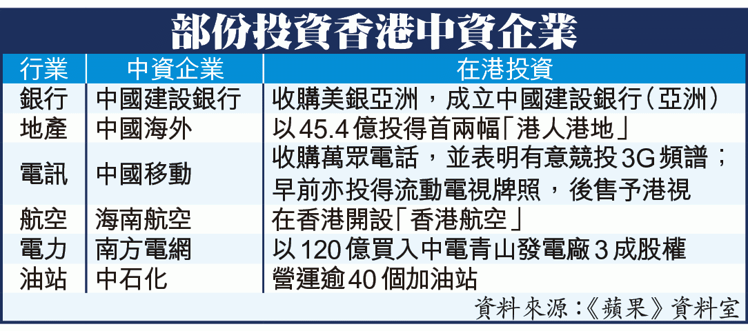 過去由本地企業主導的行業,現時均見中資縱影。05年中移動收購萬眾後打入流動電話市場,近期3G頻譜收回重拍,亦被指是安排中移動入場。中資地產亦逐步打破本地發展商壟斷,中國海外早前就投得首兩幅「港人港地」。