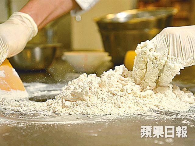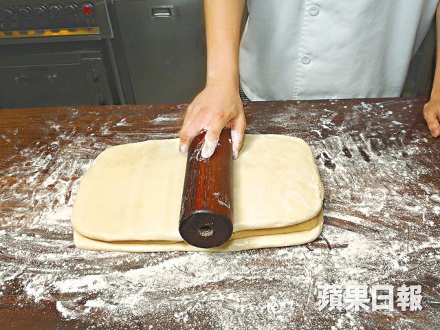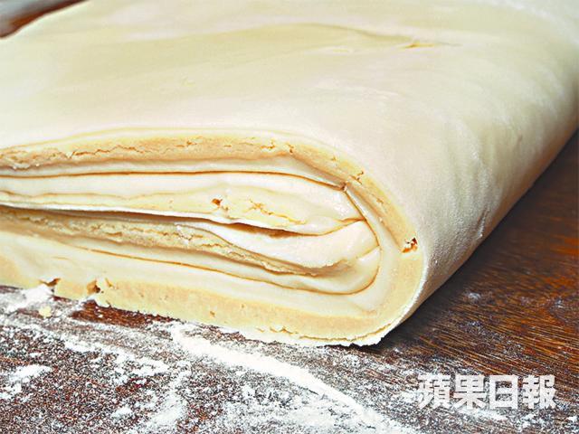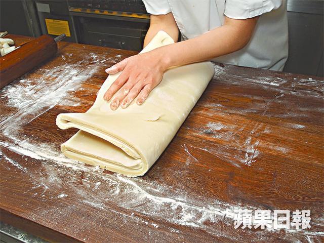 水油皮要不斷摺叠搓成,酥皮層數一般是3×3×3×4,陳師傅會在最後再加4層,總數為112層,每次摺叠後放入雪櫃冷藏,以保持水油皮的融合性,所以花的時間也較多。