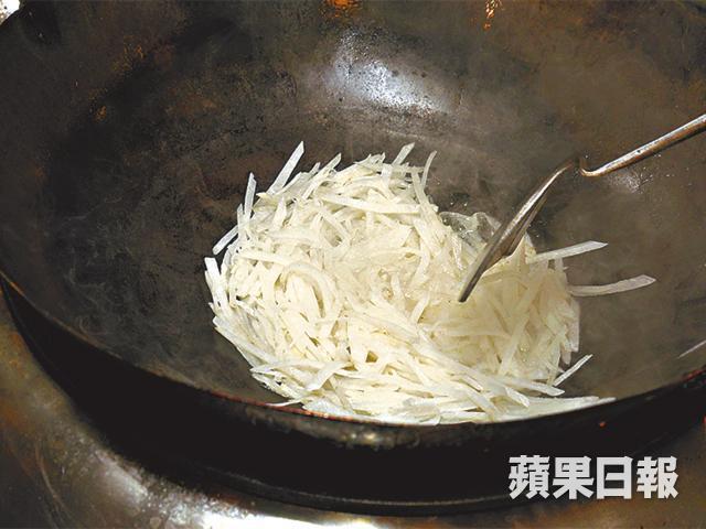 坊間為了讓白蘿蔔顏色顯白,會先切絲再蒸熟,但陳師傅指蘿蔔會碎掉,口感全失,他會先放鹽水煮八分鐘,再加入炙汁及瑤柱絲煮,這樣便能保留白蘿蔔的纖維及顏色,咬落會有一絲絲口感。