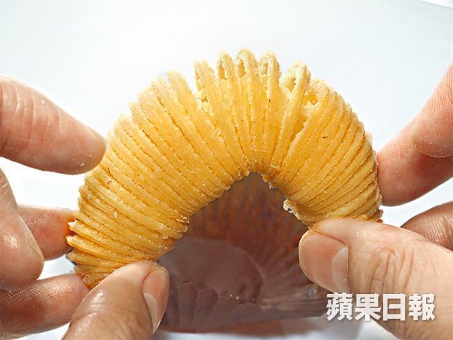 坊間的蘿蔔絲酥餅有圓形、蘿蔔形或是鵝蛋形,那有何分別?「我們做的是傳統的鵝蛋形,沒有甚麼花巧,不過這個形狀拉出來,因為頭尾會收窄,所以接口位是最薄,吃上去也不會太厚粉。」眼前的蘿蔔絲酥餅即叫即炸,略帶金黃,陳彥將它拉鬆拆開,酥皮一圈一圈地整齊地排列着。
