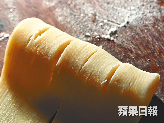 「用排絲起酥方法,有別於卷酥一拆開便即爆開,會出現一圈一圈整齊排列的酥紋。所以口感會較脆。坊間以卷酥做法較多,之前有很多師傅都有學過排絲酥,不過以失敗為多,因為做排絲酥有些竅門,過不了便是過不了。」蘿蔔絲酥餅除了白蘿蔔,還有甚麼餡料?「我們會加入瑤柱絲,除了較名貴外,還取其香味,其他還會加入火腿茸或篙筍,後者只會在春天供應,師傅葛賢蕚做篙筍蘿蔔絲酥餅便最耍家。」