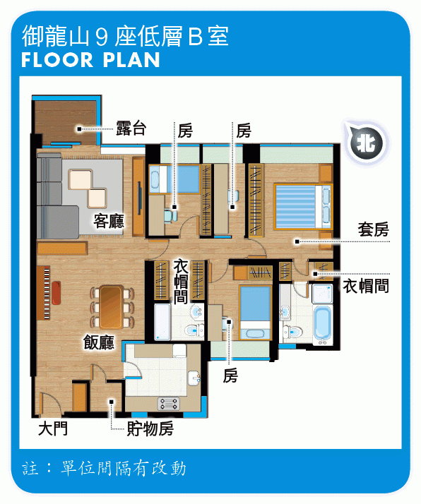 間隔:4房(1套)2廳;另露台、貯物房及雙衣帽間
