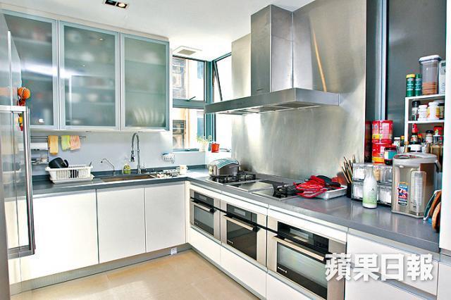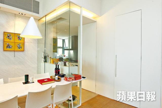 另外,玄關旁邊原有工人套房,由於業主用不着,現改為貯物房及鞋櫃,同時將貯物房改細,令大廳更加寬敞,而玄關長度亦縮短。不過,日後買家如需聘請傭人,或需重新裝修。另外,毗鄰飯廳的廚房牆身改用玻璃,令廚房更通透,大廳倍感開揚。