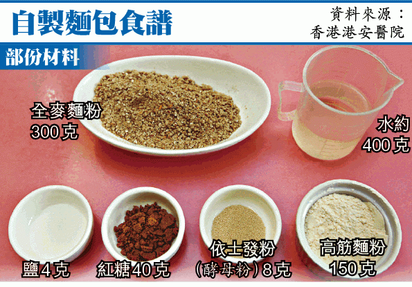 想食得健康,不妨自家製麵包。蕭鈺麟表示,自製麵包的好處是可以減少使用油、鹽及糖,如改用乾果如提子乾、杏脯,取代砂糖。市面出售的麵包多採用白麵粉,雖然口感較佳,但營養素不足。自製麵包可採用高纖全麥粉,當中含有鈣、鐵及纖維素。此外,改用酵母菌或酵母粉發麵包也屬較佳選擇,因為坊間的麵包多使用發粉、梳打粉,容易傷害胃壁,部份人進食後容易胃痛。