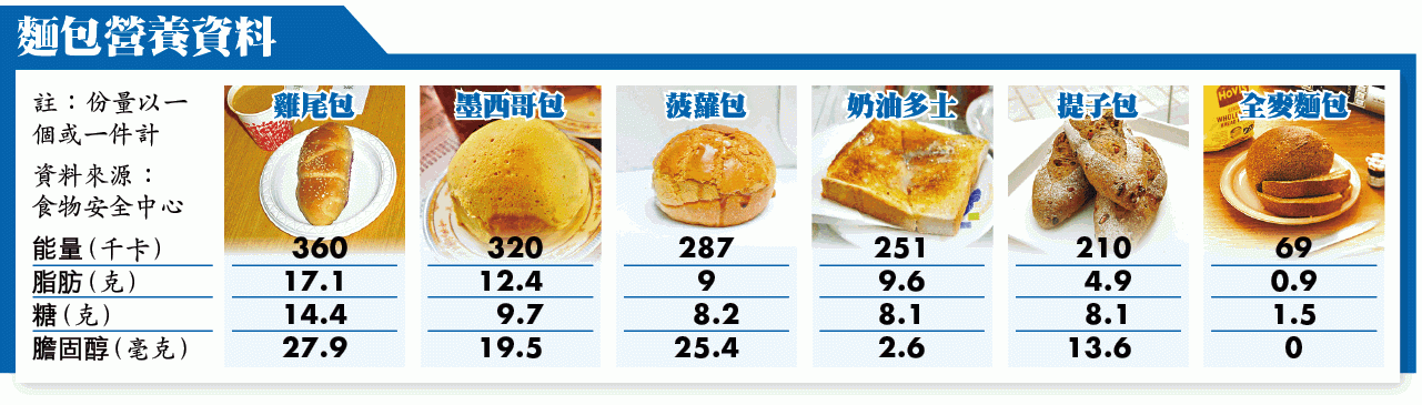 港式墨西哥包也是含較高脂肪的麵包,一個包含12.4克脂肪、9.7克糖,卡路里更高達320。以正常速度跑步1分鐘,可消耗7個卡路里計算,要抵銷墨西哥包帶來的熱量,需要跑步45分鐘。其他甚受港人歡迎的麵包,例如下午茶的奶油多、牛角包等,無論脂肪、糖份以及卡路里都偏高。