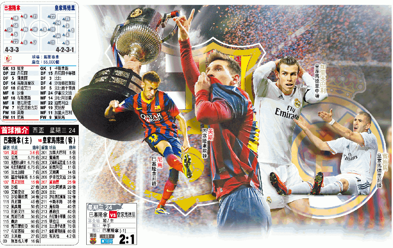 至於「戲王」尼馬對CF格蘭納達一戰,因誇張表情引來批評,但畢竟貴為足球王國巴西現時最受注目的球星,可藉今仗決賽場合洗掉污名。兩人在聯賽首、次循環都是巴塞贏波功臣,雙劍合壁下,可領球隊捧走西盃。
