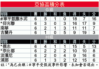 至於同組捲入假波案的寧平凱撒水泥,作客以4:1大勝仰光聯,以5勝1和首名出線,惟最終能否出線要視乎亞洲足協如何處理該隊涉嫌的假波案件。