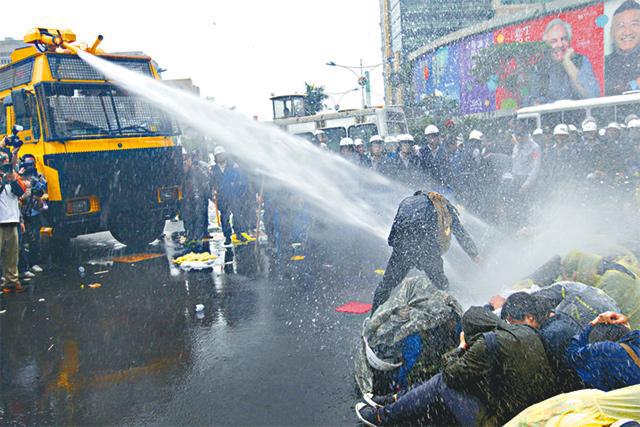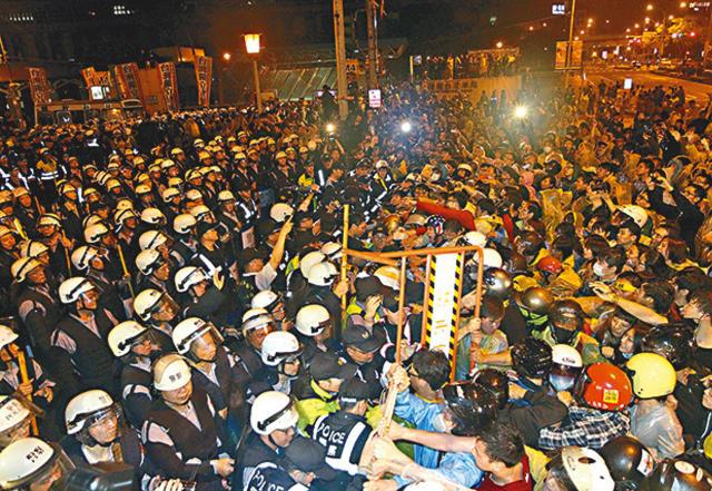 反核團體前日發動萬人遊行,當隊伍傍晚行經忠孝西路時,坐地不起佔領路面,癱瘓忠孝西路一帶交通,這是繼1992年總統直選遊行後,忠孝西路再被佔領。國民黨備受壓力下宣佈核四停工,但民間怒火沒因此平息,數百人徹夜死守忠孝西路。為顧及「佔忠」對北市交通造成沉重影響,台北市長郝龍斌前日深夜下令驅散民眾。3,000警員昨凌晨零時起展開清場行動,起初勸喻示威者離開被拒。凌晨2時50分,警方調動兩輛水炮車,先後50次噴射強力水柱,驅散民眾。過程中因水量不足,召來消防車支援,有示威者試圖爬上噴水車阻擋被制服。
