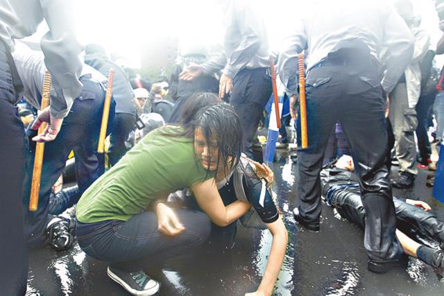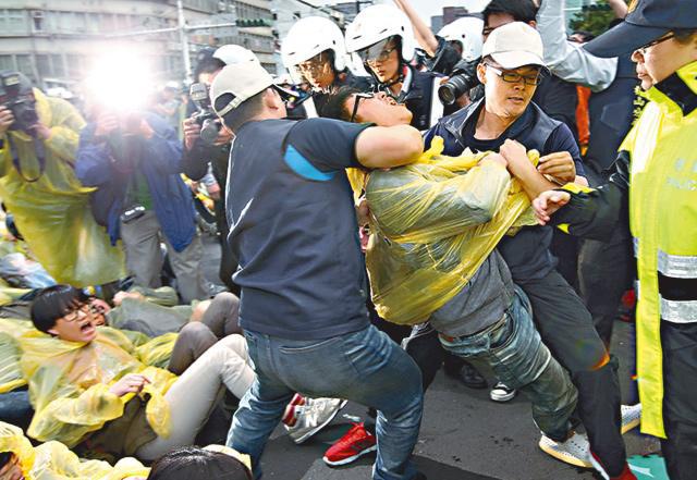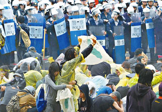 示威者早有準備,身穿雨衣手勾手躺地,阻擋警方抬離,雙方爆發衝突,部份人推擠警方及築起人牆,有家長手抱嬰兒站上前線不願離開。警員則持盾牌及警棍驅散示威者,並將民眾抬走。反服貿學運總指揮林飛帆、陳為廷亦被帶上警車。警民爆發多次衝突,示威者不斷高喊「警察打人」,台灣《蘋果日報》兩名記者亦被警方強行拖離受輕傷。