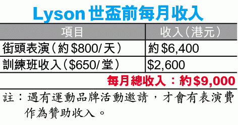 近月有網民美譽他為「MK美斯」,其街頭表演片段更在網上瘋傳。不過,掌聲怎能餬口,Lyson投身全職以來,全靠一腔熱誠支撐,收入亦只靠途人打賞以及零星的商場表演:「以往我早上返工、晚上表演,後來因欠缺休息及嚴重勞損,被醫生警告膝頭有磨蝕迹象,才決心把握青春,燃燒積蓄全職表演。收入雖不算可觀,但可幸有運動服裝及飲品贊助,亦足夠節儉過生活。」