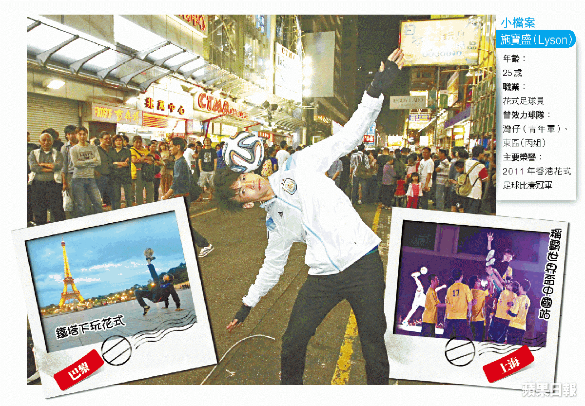 假日走到旺角(MK)行人專用區,不難發現Lyson的蹤影;藉着一個足球、一對手套,他便能變化出連串高難度動作,吸引逾百途人圍觀已算等閒事。原來早在2012年年底,這位前香港花式足球比賽冠軍得主,已放棄時裝店售貨員每月20,000元的穩定收入,毅然投身全職表演;除了活躍於旺角及銅鑼灣行人專用區,Lyson亦曾獲邀上電視節目表演。