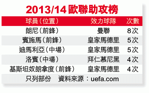 阿根廷翼鋒迪馬利亞,因加里夫巴利的加盟而改造成中場,效果竟然不錯,既保持助攻力,也憑速度加體力,為球隊作第一道防守屏障。綽號「天使」的迪馬利亞,在今季歐聯也累積了5次助攻,與前鋒賓施馬平起平坐。雖然歐聯暫時助攻王為朗尼(見附表),但所屬球隊曼聯已出局,迪馬利亞也有力挑戰助攻王之位。