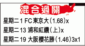 大阪櫻花有前鋒科蘭漸上力,周二於日聯主場面對聯賽4連敗的大宮松鼠,有力重開勝門,一於熱捧1.46倍的主W作過關膽。(球賽編號:星期二19;有線61及201台今日6:00pm直播)