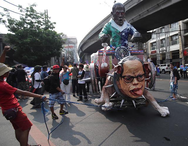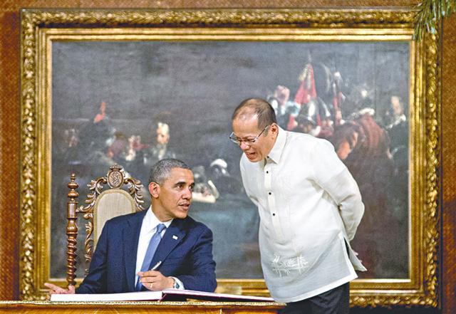 奧巴馬昨午抵達馬尼拉,隨即到總統府跟菲總統阿奎諾三世(Benigno Aquino III)舉行𥧌會,之後出席聯合記者會。奧巴馬被菲律賓記者問到「一旦中菲在南海爆發武裝衝突,美國會否保衞菲律賓」時說,「我們的目標並非遏制中國,也不是圍堵中國,我們的目標是確保國際規則及規範得到尊重,包括國際爭議……我們對國與國之間的領土爭議不持特定立場,但也不認為脅迫及威嚇是處理爭議的方法」,美國希望有爭議的國家透過對話解決紛爭。
