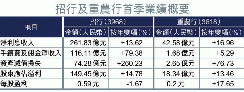 倘比較盈利能力,光銀則為多隻內銀股中最令人失望,該行去季純利增2.55%至81.67億元,為唯一盈利表現遜預期的內銀。同日公佈業績的招行及重農行純利均按年達雙位增長,當中,招行受同業拆息及客戶存款成本上升影響,淨息差按季收窄14點子至2.65厘,幸該行中間業務收入增長達遠超預期的八成,令其首季度純利增長14.78%至149.45億元,險守預期下限。重農行首季純利增長13.47%至18.34億元,符預期。