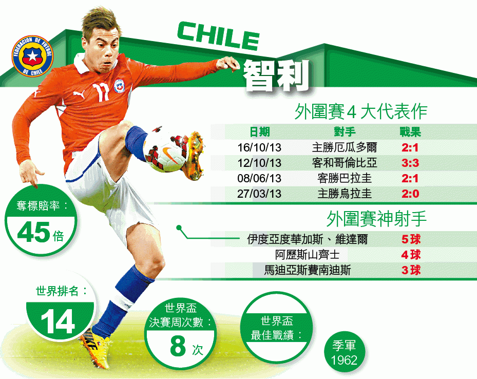 智利近年湧現了不少球星,尤其是在中前場,有不少效力歐洲頂級球會的出色球員,包括巴塞隆拿的前鋒阿歷斯山齊士,他更是現役智利國腳中,入球最多的一人。
