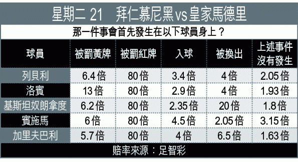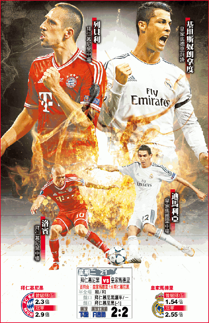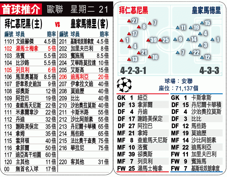 衞冕歐聯的拜仁慕尼黑,周二在4強次回合主場出擊再鬥皇家馬德里,力圖收復首回合輸0:1失地;以首回合拜仁縱贏形勢,教練哥迪奧拿仍被球會名宿炮轟,今仗料將會更直接攻擊皇馬大門,但皇馬重組「BBC」組合也絕非流料,入球「大」雖然只得1.5倍,仍然可以熱捧。(球賽編號:星期二21;有線61、64、201及203台明日2:45am直播)