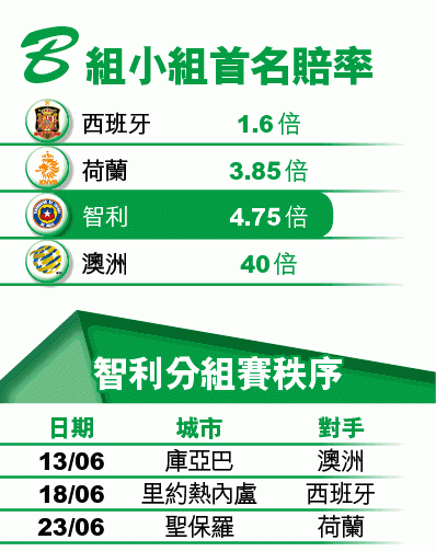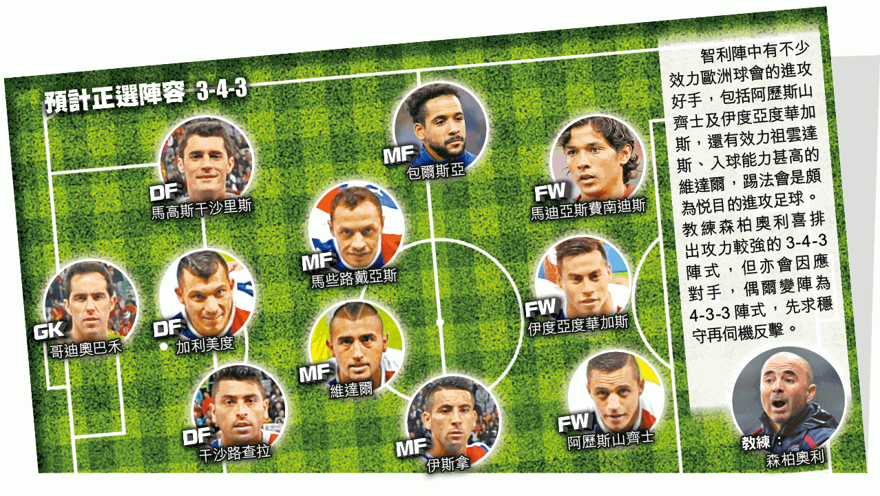 儘管森柏奧利這樣說,從客觀條件來看,智利絕非全無本錢在B組突圍;西班牙和荷蘭面對這支南美黑馬,亦不敢豪言可以輕鬆取勝。文:何西