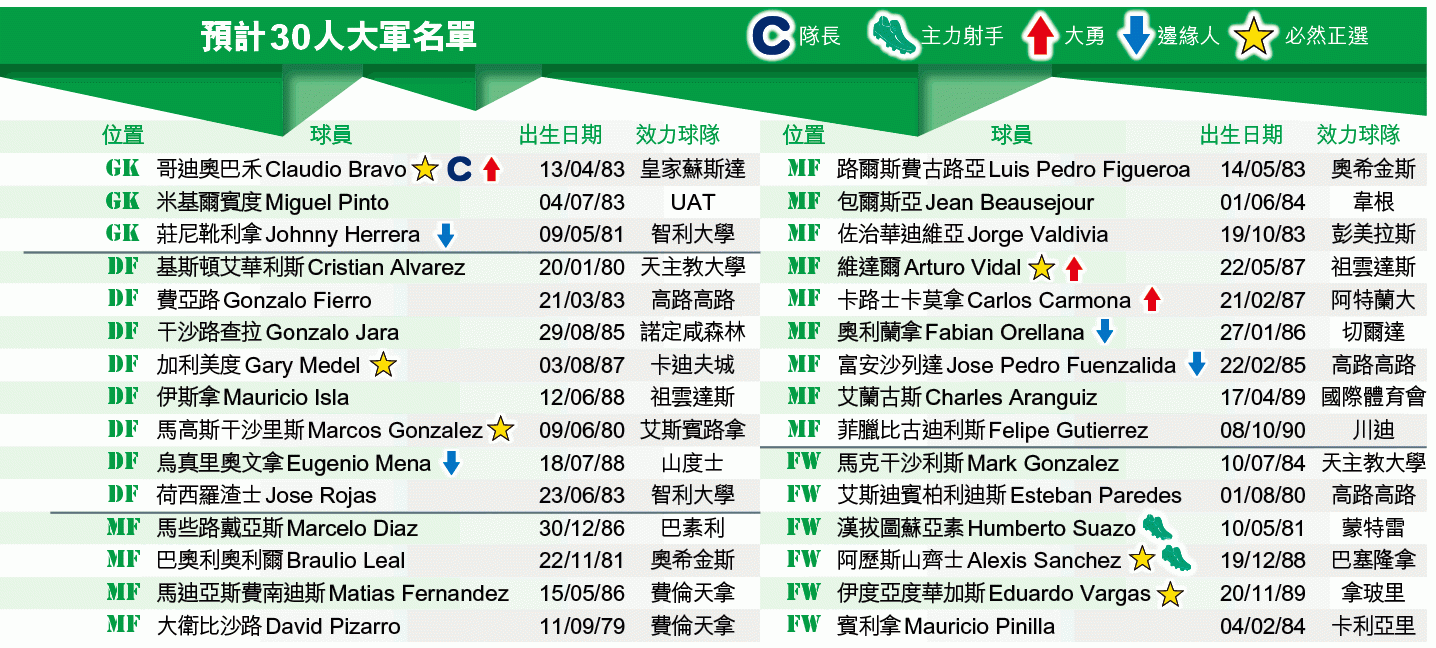 當中效力祖雲達斯的中場維達爾近年鋒芒盡露,自2011年由德甲利華古遜登陸意大利後,其進攻潛力進一步被發掘,成為智利進攻三叉戟中的一把利刀;除了入球能力出色外,他在中場效率也高,傳送與掃蕩協防等工作也到家,是智利重要的發電機。不過,維達爾在過去1個月受到膝傷困擾,不是退居後備便是缺陣,智利陣營對他的情況亦甚為緊張,早前派出軍醫前往都靈,以了解其傷情。