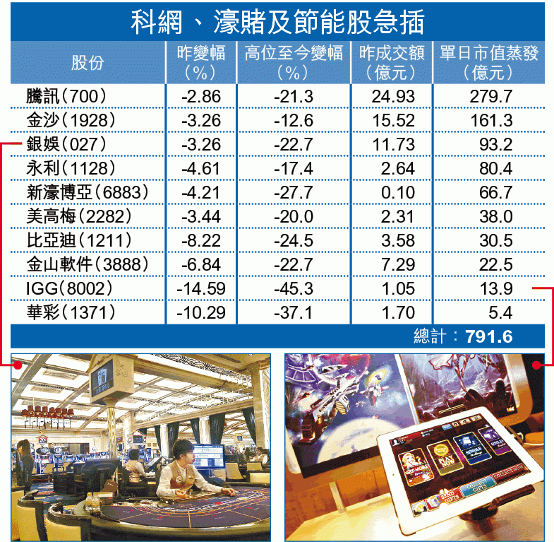 不過,昨日重創的股份並不是傳統中資股,而是年初瘋極一時的新經濟股份,繼3月份過後,科網、濠賭股昨日再一次面臨洗倉命運。