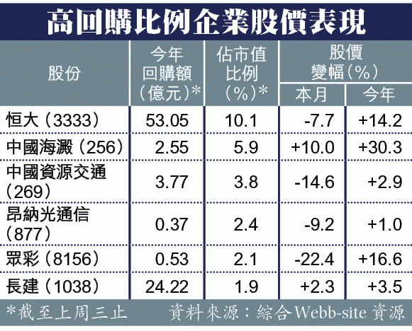 事實上,恒大的回購動作在近兩月已無影,股價4月至今大回吐近8%,拖低今年升幅由超過兩成變至約14%;其餘今年回購佔市值逾2%的昂納光(877)、中國資源交通(269)及眾彩(8156)等雖然一度走強,惟本月已分別大回吐9.2%、14.6%及22.4%。