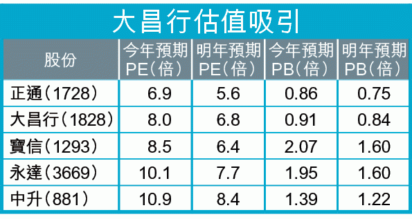 2)大昌行今年預期PB 0.91倍,高於正通而遠低於其他同業。過去五年大昌行平均PB 1.70倍,現時折讓46%。
