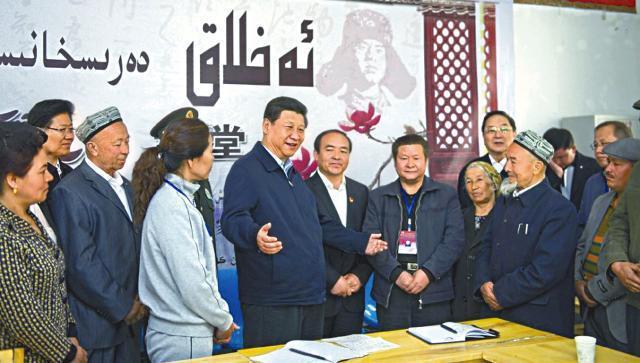 習近平此次考察有軟有硬。在一些鏡頭中,他如同過往的中共高官一樣,主動戴起維族男子的四角維族花帽,又與一群維族學生聊天。但在另一些鏡頭中,他卻身穿戎裝,又發表態度強硬的反恐講話:「堅決遏制和打擊境內外敵對勢力利用民族問題進行的分裂、滲透、破壞活動。加強反恐力量建設。」習特別到訪民族矛盾最突出的南疆喀什地區,並與當地派出所警察交流。他甚至親自檢查警方的警棍,還大發感慨:「看到你們的長警棍,我不由想起明代時戚繼光訓練怎麼打倭寇,他就地取材,把毛竹削尖,很長,五人或七人一組,先用毛竹竿擋住倭寇,使他們近不了身,盾牌兵再上去擊殺,非常有效。」