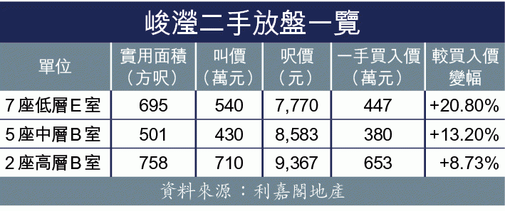 現時屋苑大約60個單位放盤,較為貼市價的約有10多個,平均每呎叫價由8,000至1萬元不等。值得一提的是,由於項目乃2012年7月左右開售,故一手業主「捱到」今年7月已可鬆綁,據悉一般放盤業主都以平手離場為底線,以近期放盤的5座中層B室為例,業主於2012年以380萬元買入,現時叫價430萬元,成功出售的話賬面只是微賺50萬元左右,若被還價的話連同雜費就很大機會平手出貨。