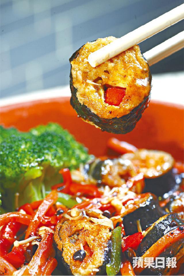 東方小祇園部長馮潤培指早已不是單用樹記腐皮入饌,「十多年前獨用他們的貨,可是有時供應量不足,故開始同時向三至四間腐皮供應商取貨。問及樹記的質素是否較好,他表示每間都差不多,最重要是豆味重。店內部份菜式以腐皮為主,其中玉柳金菇卷餡料十足,以素肉及金菇塞滿層層腐皮。馮潤培指此菜式用上三塊厚身腐皮重叠一起,完條捲好後以大火猛炸,炸約一分鐘至金黃色便可切件上碟,火候需掌握得好,過火會䊹口難食,食前淋上上湯,成品色澤晶瑩泛黃,一咬,又腍又脆,金菇爽中帶軟,層次豐富。另一腐皮菜式素鰻魚顏色深黑,切件平放確有幾分似鰻魚,製作工序頗複雜,先用五塊腐皮包裹紅蘿蔔及西芹,外層再加一塊紫菜捲好,捲時要壓實定形,然後切件輕炸,最後再以豆豉汁燜一分鐘就可上枱,腐皮吸了豉汁香味四溢。齋滷味當中以齋燒鴨最受歡迎。坊間雖有現成齋燒鴨,惟老店仍堅持自家製作,因擔心現成的加了齋舖禁用的食材。一條齋燒鴨用上三塊腐皮,腐皮先輕浸自家熬製的白滷水,然後捲好以中火即炸。口感酥香,不甚油膩,食不出滷水味,只有陣陣鹹香,還可蘸喼汁解膩。