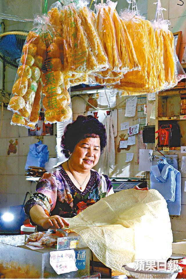 幸好,還有關興記。八十多年歷史,在西營盤無人不識。老闆關周鳳瓊一生與腐皮打交道,她坦言早在20年前腐皮已並非香港製造,大部份都是內地生產。「香港有做腐皮產品的廠商有榮昌、中興、劉中興和鴻福,多是由香港運黃豆往內地製造。」以前選用內地黃豆,當中以黑龍江黃豆的質素最高,但做出來的產品顏色呈暗黑色,現在多用加拿大及美國黃豆,「美加黃豆蛋白質含量較高,做出來的腐皮色澤亦較金黃。」由於聲稱香港製造客人會更安心食用,故各廠均絕口不提是內地製造。