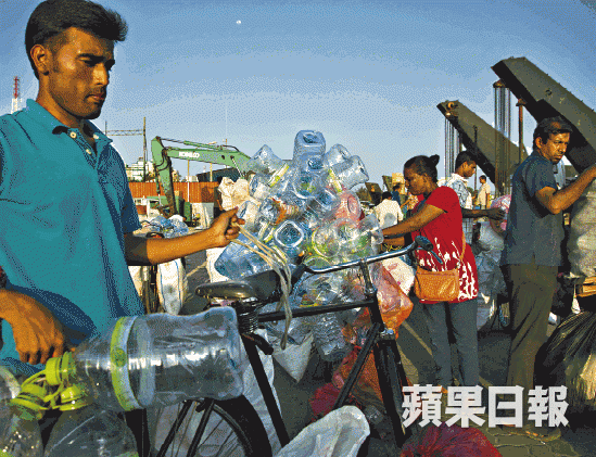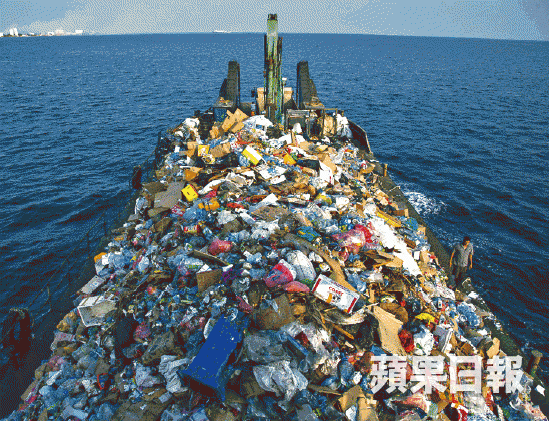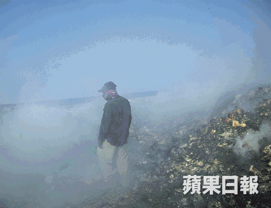 「在垃圾堆中找出可回收的鐵罐、膠樽和金屬等,其他廢物則就地焚燒。」一名工人說。垃圾經海路運到小島,隨即以人手篩選,小部份被焚化,其餘則傾倒在堆填區上,成為小島填海工程的一部份。舉目所見,塑膠樽和各種廢物堆積如山,加上漫天蒼蠅和中人欲嘔的惡臭,工人都得把毛巾包着頭臉。