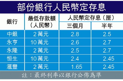 目前本港銀行三個月及六個月人民幣定存息普遍有約2厘,小部份超過3厘息的優惠已陸續到期,目前以滙豐一個月定存3.8厘優惠最矚目,優惠期至6月中,最低存款額亦只需2萬元人民幣;倘起存額多達10萬元,則以中小型銀行如創興(1111)及永隆最高息,半年及一年定存息均超過3厘。