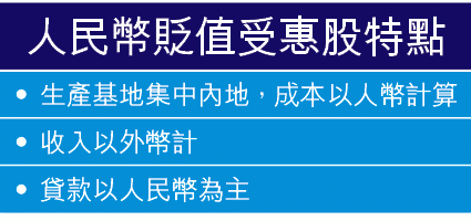 以人民幣為主要貸款的企業,亦可因為滙價下跌,令債務壓力減輕。證券商里昂指出,本地地產股新世界(017)、航運股東方海外(316)及電子產品生產商偉易達(303),均擁有大量人民幣債務,可受惠今輪貶值潮。另外,資源股如江西銅(358)、招金(1818)亦因為商品價格多以美元計價而受惠。
