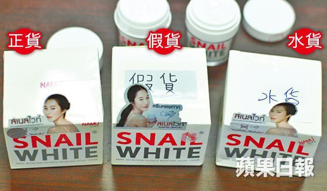 經SNAIL WHITE香港代理商銷售經理李小姐證實,Kay買到的並非正貨。李小姐透露,近半年每月平均接獲逾30宗真假貨的電話查詢,幾乎每月至少一宗證實為假貨,最高峯一個月有10多宗,全部已通報海關跟進;亦有投訴人夾附照片寄來,指使用聲稱屬水貨的蝸牛霜後,皮膚現紅疹須求醫。