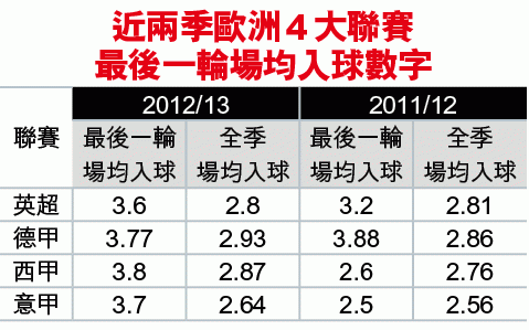 各大聯賽將於未來兩星期煞科,今周先有德甲及英超,下星期就到西甲及意甲,參考近季這4大聯賽最後一輪的入球數字,會否有所啟示(見附表)?
