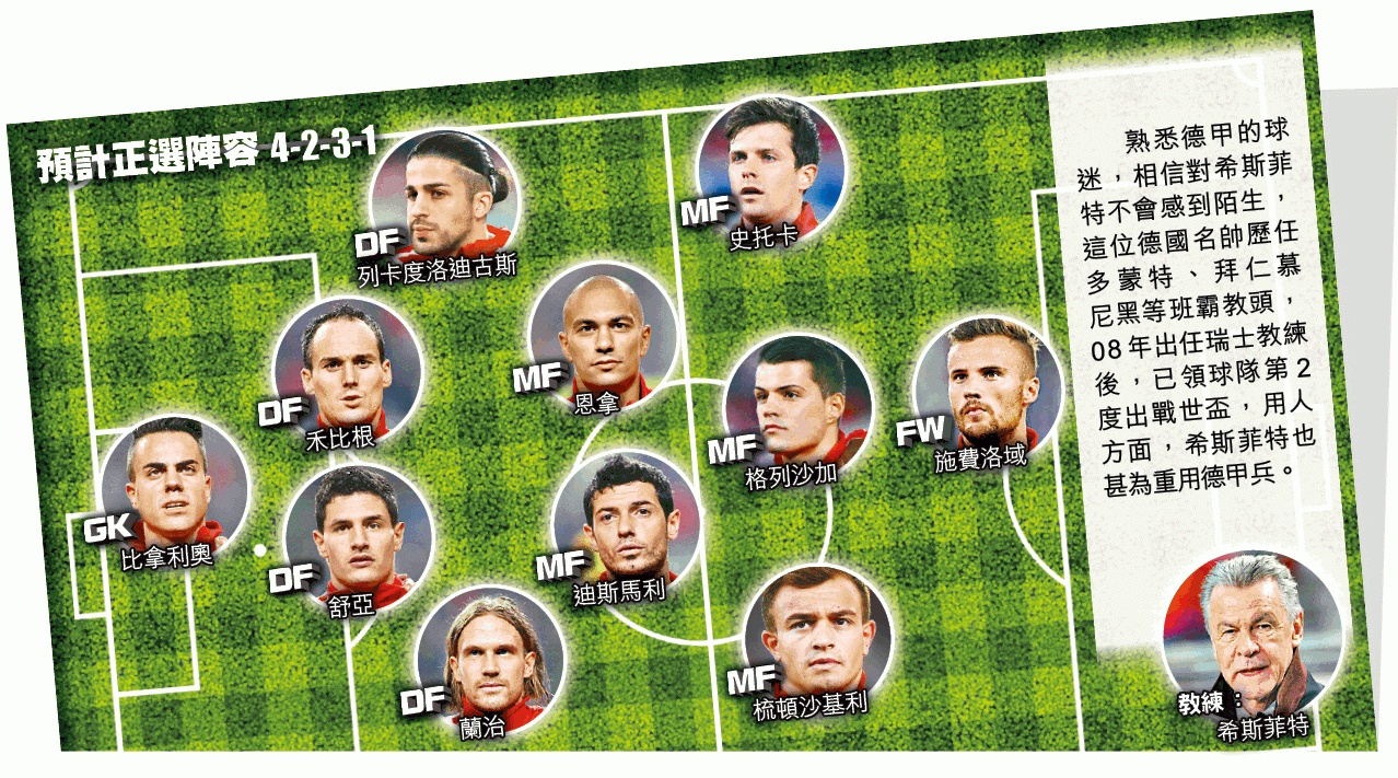 希斯菲特曾分別帶領多蒙特和拜仁慕尼黑,奪得德甲聯賽冠軍和歐聯冠軍,執教功力不用懷疑。在2008年主場出戰歐國盃成績未如理想後,瑞士就邀得希斯菲特執教,希望撥亂反正,這位德國名帥接手瑞士後,已錄得55戰26勝18和11負的戰績,得勝率接近50%,尚算不俗。希斯菲特已宣佈在世界盃後離任,瑞士眾將或會特別賣力,為這位名帥帶來一個美好結局。