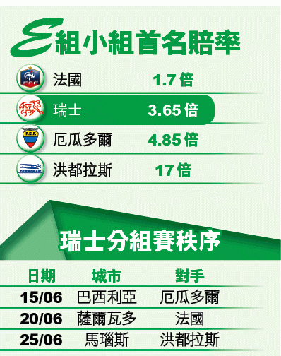 無獨有偶,今屆這兩隊之間的對賽亦被安排在第3輪舉行,洪都拉斯或會再次成為瑞士出線的攔路虎。這一組的球隊平均實力不算太強,如果法國表現又再次失準,瑞士以首名晉身16強亦不足為奇。文:飛奧