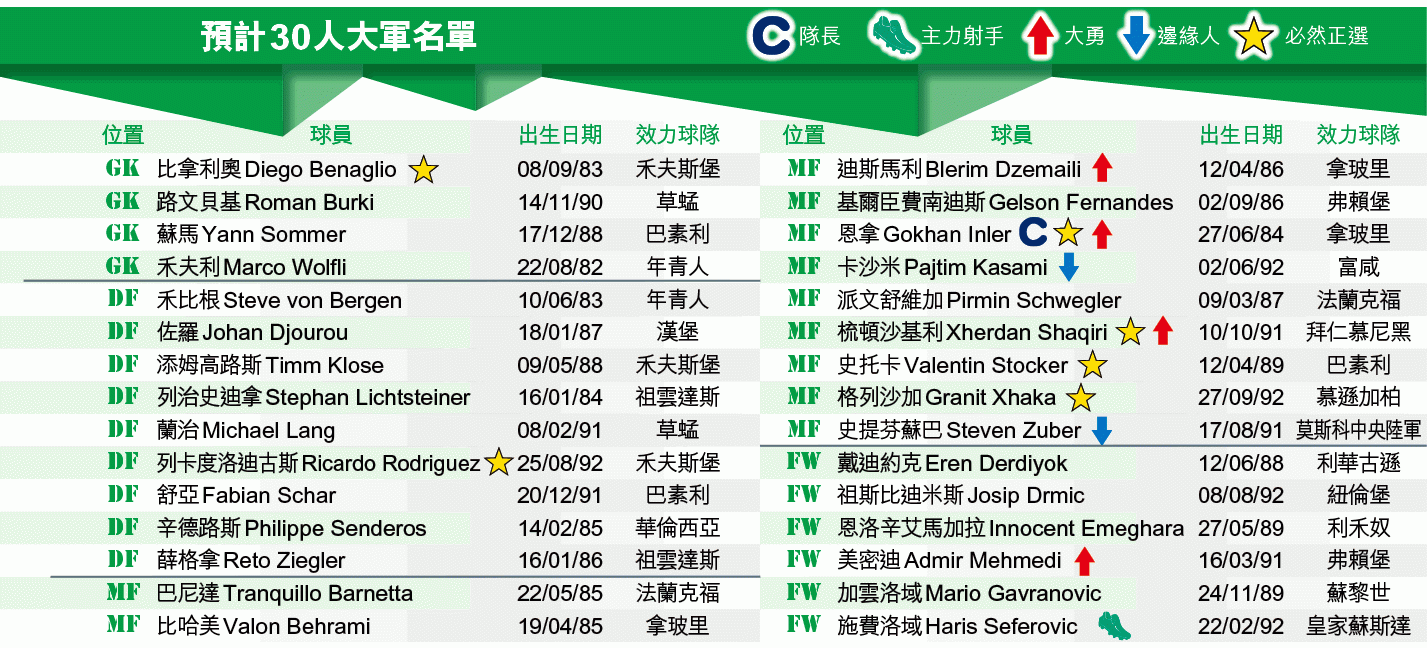 上屆世界盃結束後不久,隊長阿歷山大費爾退出國家隊,瑞士改由拿玻里中場恩拿擔任隊長,配合一眾年輕有活力的球員,為球隊帶來一番新景象。今屆的瑞士,含有不少德國味道,兩名年輕攻擊球員:梳頓沙基利(Xherdan Shaqiri)及格列沙加(Granit Xhaka)絕對是焦點,兩人分別效力拜仁慕尼黑及慕遜加柏,此外,瑞士陣中亦有射手祖斯比迪米斯、美密迪、列卡度洛迪古斯、佐羅和基爾臣費南迪斯等多位在德國聯賽搵食的球員,更有一位德籍名帥希斯菲特。
