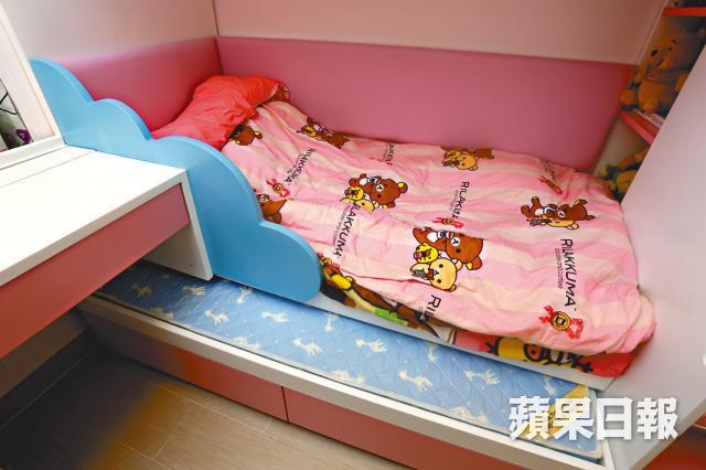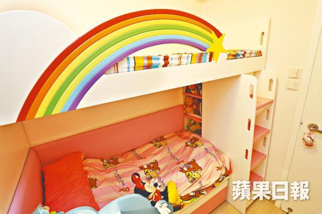 兩歲多女兒的睡房悅目繽紛,化身為粉色彩虹天地,房內一張組合床正是主題所在,下格床有藍色雲兒床欄,配以粉紅色軟墊圍牆,防跌防撞,做足安全措施。上格床欄以七色彩虹及黃色小星作伴,彷彿打造一片天,伴隨囡囡同玩同睡。