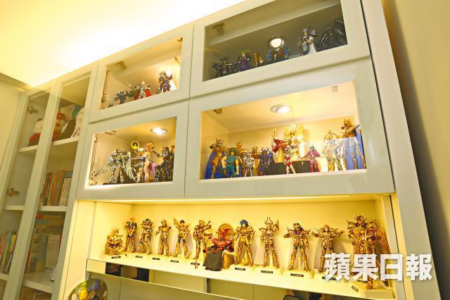 爸爸的書房純白色,閱讀書寫較精神。由於珍藏約百個聖鬥士星矢精品,它們是房間的主角,訂做飾櫃匠心獨運,配水晶玻璃面,玲瓏剔透,又沒有普遍玻璃的綠色邊,底部焗白油四方框,櫃內鑲射燈,便能成功聚焦,慢慢欣賞。